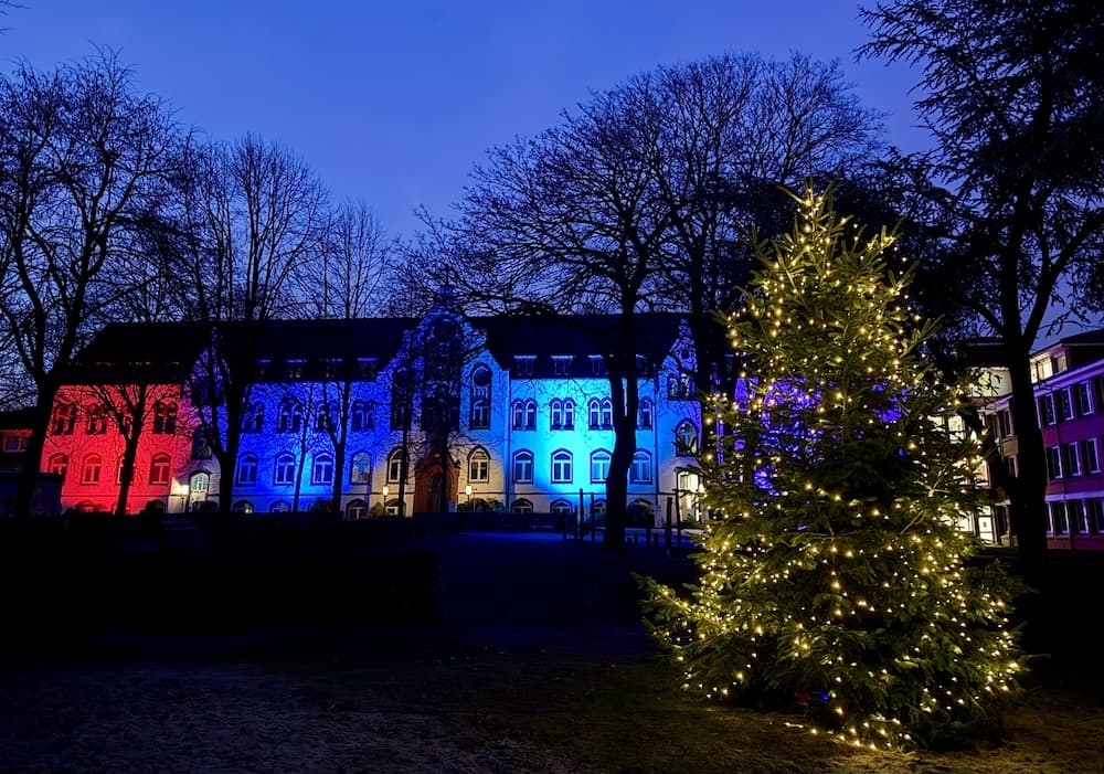 ... zeigt das weihnachtlich geschmückte und erleuchtete Marianum.