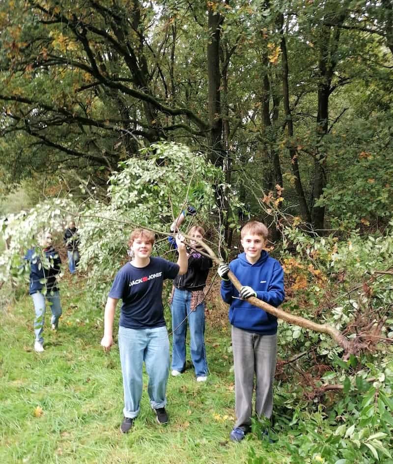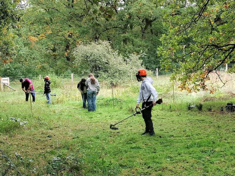In der letzten Woche vor den Ferien standen verschiedene Pflegearbeiten im Schulwald an. Trotz der ganzen dafür notwendigen Ausrüstung sind wir klimafreundlich zu Fuß zum Schulwald gelaufen. Dort haben wir uns auch schnell an die Arbeit gemacht. Unser Auftrag war es, die invasive Baumart ‚Spätblühende Traubenkirsche‘ auszureißen, zurückzuschneiden oder schon größer gewordene Äste mit Astsägen abzusägen. Dabei kamen viele Sträucher zusammen. Es hat sich also gelohnt. Außerdem haben wir das Gras im Eingangsbereich und beim grünen Klassenzimmer gemäht. Unsere Vorgehensweise war simpel: Jeder hatte seine individuelle Aufgabe. So sind wir schnell und produktiv vorangekommen. Abschließend sind wir dann wieder zurück zur Schule gelaufen.