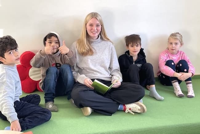 Nach einer stimmungsvollen Begrüßung in der Overberg-Turnhalle und einem ersten gegenseitigen Kennenlernen verteilen sich Vorleser und Zuhörer kleingruppenweise in allen Ecken der Schule. Man macht es sich gemütlich, kommt miteinander ins Gespräch, und natürlich wird vorgelesen. Passend zum diesjährigen Motto „Vorlesen spricht deine Sprache“ ist der Vielfalt der Geschichten keine Grenze gesetzt und es wird sogar eine ukrainische Vorlesegruppe gebildet, die die Erlebnisse von „Bobo Siebenschläfer“ in der eigenen Muttersprache verfolgt. „Ich fand es toll, dass Melvin uns auf Ukrainisch vorgelesen und uns Fragen zur Geschichte gestellt hat. Melvin war total nett, das hat Spaß gemacht!“, sagt Emiliia aus Klasse 2b mit leuchtenden Augen. Auch Karl ist begeistert: „Wir konnten zum Vorgelesenen Bewegungen mitmachen. Ferdinand hat mitgesprochen, weil er Pippi Langstrumpf auswendig kann. Ich fand das klasse.“ Den gegenseitigen Gewinn der Aktion bestätigt Marianum-Schülerin Alea: „Am Anfang war ich ganz schön aufgeregt, aber die Kinder waren sehr interessiert und wir lagen sofort auf einer Wellenlänge. Es war ein super Erlebnis!“