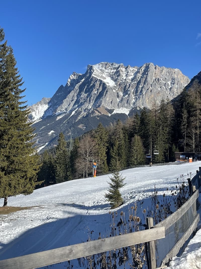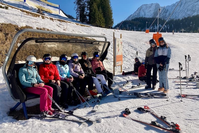 Bereits am Ende des zweiten Tages fuhren die meisten Schüler/innen wie an einer Schnur gezogen die blaue Piste hinunter, auch wenn die erforderliche Kurve manchmal erst im zweiten oder dritten Anlauf gelingen wollte. Aufgrund der schnellen Lernfortschritte wurden in der Folge auch der gefürchtete Ankerlift und der nostalgische 2er-Sessellift bezwungen, so dass wir uns bereits am Mittwoch und auch am Donnerstag auf den Weg ins benachbarte Ehrwald machten, um dort richtig Pistenkilometer auf unsere Apps zu spielen. Hier wurden von der ganzen Gruppe Family Parks und Fun Slopes sowie auch deutlich anspruchsvollere Engstellen bezwungen. Man musste auch erkennen, dass in anderen Skigebieten mit deutlich mehr Trubel zu rechnen ist als im beschaulichen Biberwier.