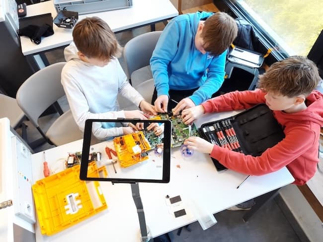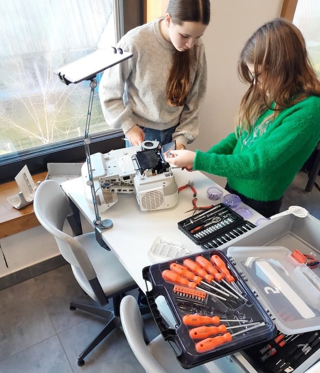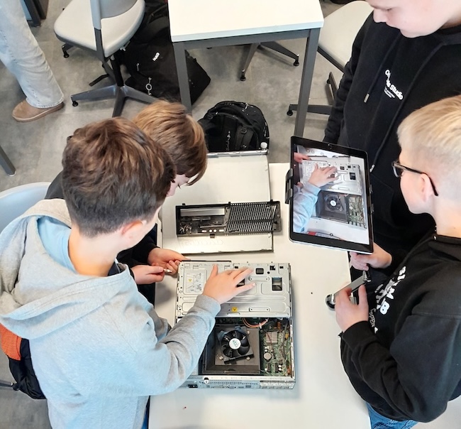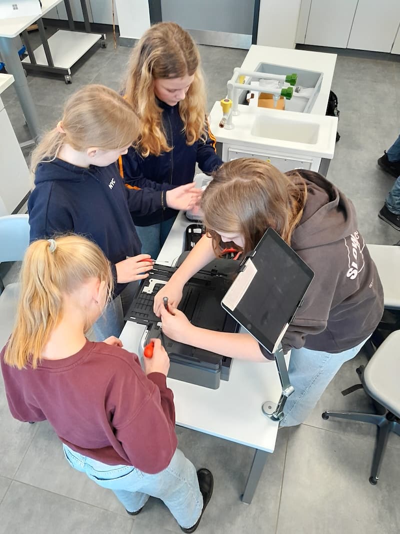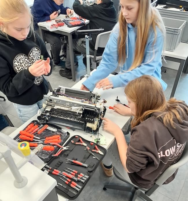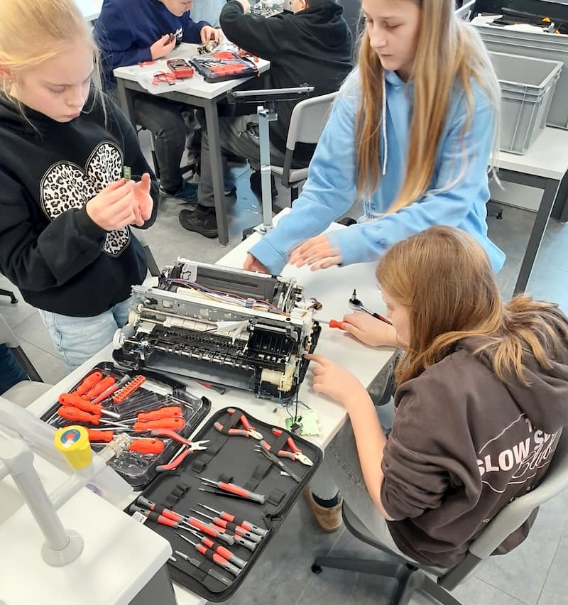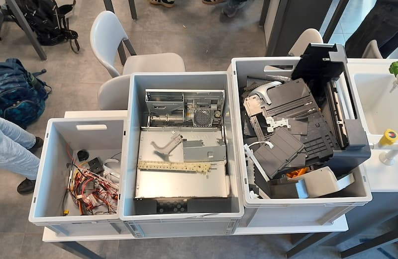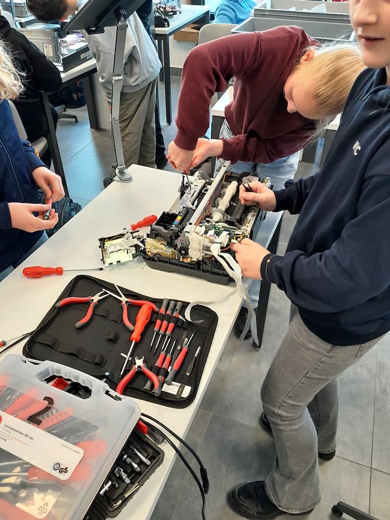 Ziel des Projekts war es, technische Geräte aus dem Alltag der Kinder kritisch zu untersuchen und ein Bewusstsein für Ressourcenverbrauch, Recycling und Reparaturmöglichkeiten zu entwickeln. In Kleingruppen arbeiteten die Schüler:innen mit ausgedienten oder defekten Geräten wie Druckern, PCs, Beamern oder Defibrillatoren. Diese wurden mithilfe von Werkzeugen und Spezialausrüstung schrittweise demontiert. Dabei erkundeten die Schüler:innen den inneren Aufbau der Geräte, identifizierten einzelne Bauteile und ermittelten deren Funktionen. Schnell wurde deutlich, wie komplex moderne Technik konstruiert ist und welche Herausforderungen sich daraus für mögliche Reparaturen ergeben.