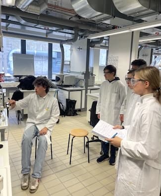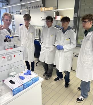 Dort wurden wir bereits von Herrn Holtkamp, dem Laboranten des Arbeitskreises von Prof. Dr. Karst, in Empfang genommen. Nach einer kurzen Vorstellung des Fachbereichs sowie einer Sicherheitsunterweisung wurden wir in zwei Gruppen aufgeteilt. Die erste Gruppe erhielt von Prof. Dr. Karst anhand kleiner Alltagsversuche eine Einführung in das Thema Spektroskopie. Dabei wurden unterschiedliche Lichtfarben sowie die Unterschiede zwischen sichtbarem und nicht sichtbarem Licht veranschaulicht, sodass wir einen direkten Einblick in eine universitäre Vorlesung bekamen. Anschließend hatten wir die Möglichkeit, Prof. Dr. Karst Fragen rund um das Chemiestudium und das Studentenleben zu stellen. Im Anschluss führte uns Herr Dr. Buscher, ein wissenschaftlicher Mitarbeiter des Arbeitskreises, über das Gelände der chemischen Fakultät. Dabei konnten wir unter anderem den größten Vorlesungssaal besichtigen, der Platz für etwa 400 bis 500 Personen bietet, sowie verschiedene Labore und Seminarräume, in denen während des Studiums experimentelle Praktika und Seminare stattfinden.