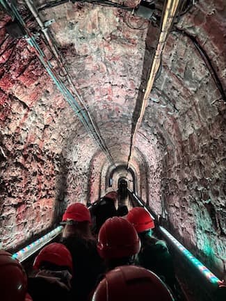 Am zweiten Tag starteten wir mit einem gemeinsamen Frühstück. Danach packten wir unsere Sachen für die Kohlemine, in die wir anschließend fuhren. Dort angekommen, wurden wir mit Helm und Lampe ausgestattet, haben uns in zwei Gruppen aufgeteilt und wurden so durch die Mine namens Guido geführt. In über 300 Metern Tiefe mussten wir teilweise durch Gänge mit verhältnismäßig niedrigen Decken gehen, sodass wir gebückt laufen mussten. Wir gingen auch einige Treppen in die Tiefe. Am Ende der Führung fuhren wir mit einer Grubenbahn zurück. Im Anschluss aßen wir im gleichnamigen Restaurant zu Mittag. Daraufhin fuhren wir zu einer weiteren Mine, dem „Königin-Luise-Stollen“. Dort wurden wir ebenfalls mit Helmen ausgestattet. Danach sind wir mit einem Boot in einen engen Tunnel gefahren und liefen auch durch verschiedene aneinandergehängte Tunnel. Während wir Geschichten über die Mine gehört haben, sahen wir Lichteffekte und verschiedene Darstellungen an den Wänden. Zum Schluss der Tour sind wir wieder mit einer Grubenbahn nach oben gefahren. Nach dem spannenden Vor- und Nachmittagsprogramm sind wir mit dem Bus in die Stadt gefahren, um dort in kleinen Gruppen zu essen und die Stadt zu erkunden. Anschließend sind wir zurück zur Jugendherberge gelaufen und haben den letzten Abend dort gemeinsam beendet.