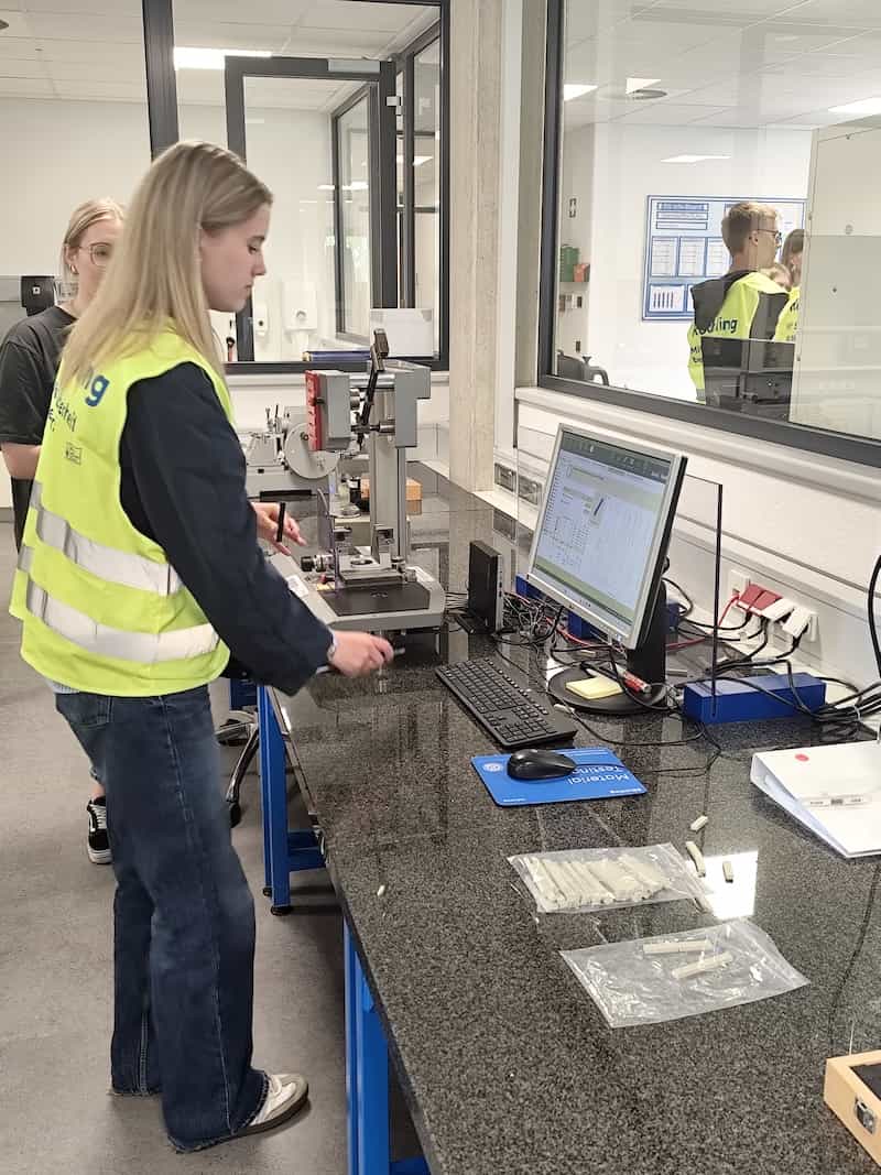 Zunächst wurden wir durch die Kunststoffprüfung geführt. Dort lernten wir verschiedene Prüfverfahren kennen und konnten „live“ miterleben, wie unterschiedliche Kunststoffe auf ihre Qualität und Belastbarkeit durch Ziehen, Schmelzen, Brechen und andere Verfahren getestet werden. Einige Tests durften wir sogar selbst durchführen oder aus nächster Nähe beobachten, was uns einen praxisnahen Eindruck vermittelte.