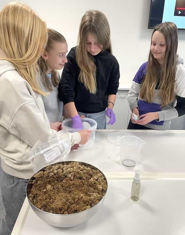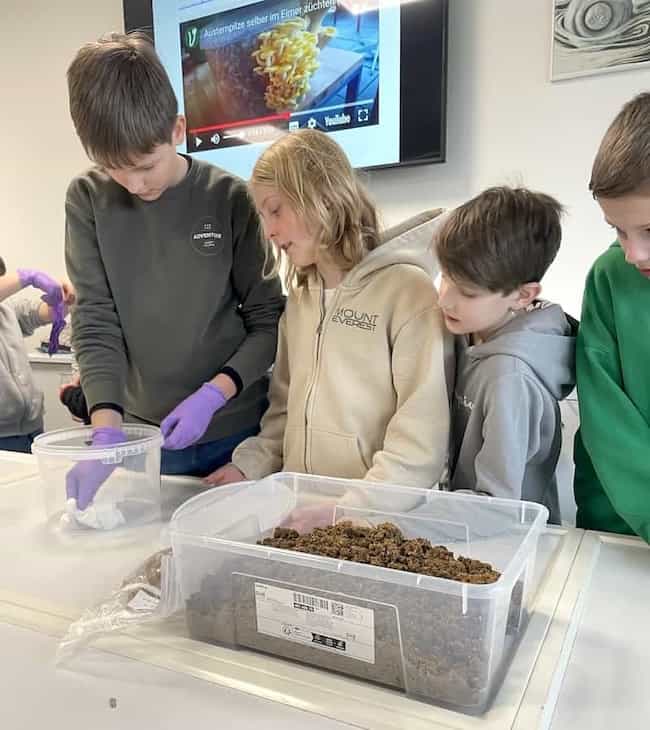 Schon im letzten Schuljahr haben sich das MINT-Profil des 6. Jahrgangs und die Klasse 10d der Pilzzucht verschrieben. Mit DIY-Sets sollte der eigenen Pilzernte nichts mehr im Wege stehen. Penibel wurde auf die notwendige Hygiene beim Umgang mit den Pilzkulturen geachtet, um keine ungewollten Fremdpilze in den Zuchtboxen zu kultivieren. Ein Teil der Boxen wurde dann an einen hellen, aber nicht sonnigen Platz gestellt und ein anderer Teil in einen Reifeschrank, in dem die Umweltfaktoren Temperatur und Luftfeuchtigkeit zusätzlich an die Anforderungen der Pilze angepasst werden können. Nach getaner Arbeit konnte dann die Entwicklung der Pilzzucht in einem Livestream über YouTube verfolgt werden.