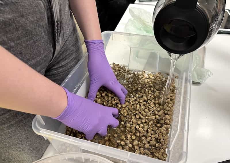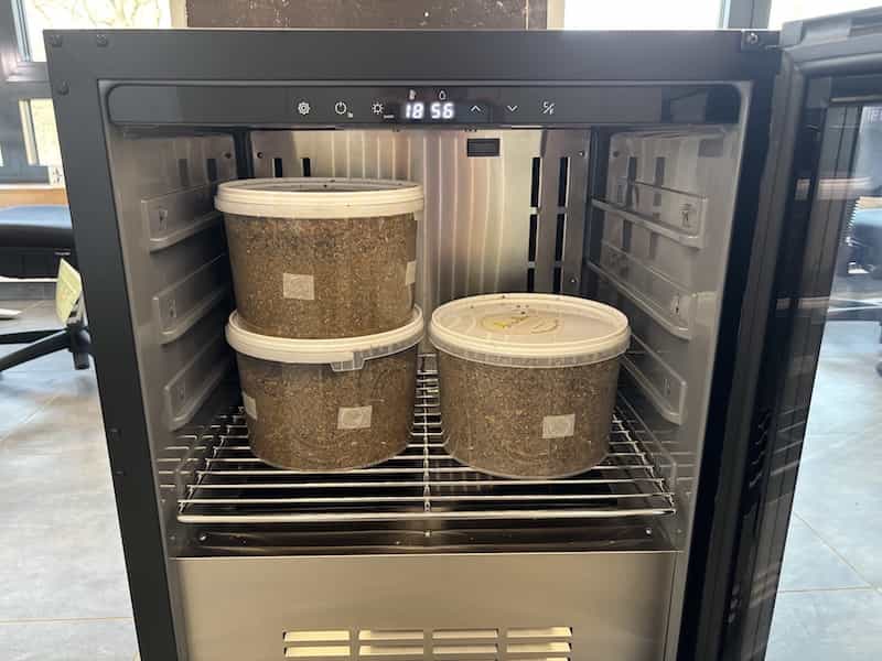 Die zu erwartenden langweiligen ersten vier Wochen, in denen äußerlich nicht viel, passiert und der Pilz das Myzel aufbaut und das Substrat durchwächst, wurden von den Schüler:innen tapfer ertragen. Doch als auch nach acht Wochen weder im noch außerhalb des Reifeschranks keine Veränderungen zu beobachten waren, wurden die Schüler:innen und die Lehrkräfte langsam nervös, da die Sommerferien schon vor der Tür standen.