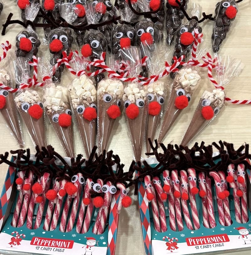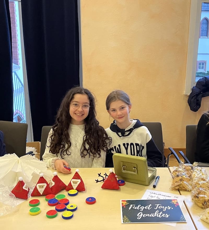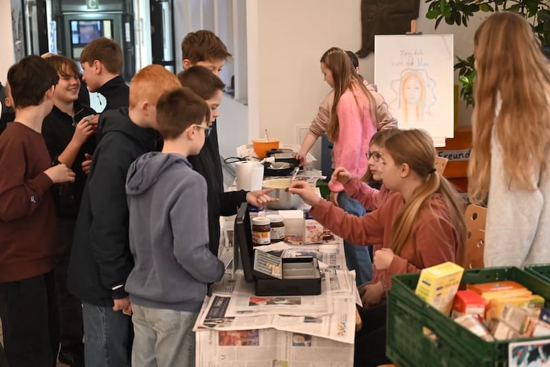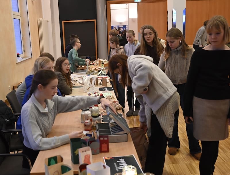 Am Tag des Marzars selbst wurden die selbstgebastelten Artikel dann in der Aula an unterschiedlichen Verkaufsständen angeboten. Auch beim Verkauf haben viele Schülerinnen und Schüler mit Begeisterung und Motivation in Kleingruppen mitgeholfen. So konnten alle Besucherinnen und Besucher des Marzars von 8 bis 17 Uhr die weihnachtliche Atmosphäre mit Kakao und Waffeln genießen und kurz vor den Weihnachtsferien z.B. noch letzte Weihnachtsgeschenke erwerben. Besonders beliebt waren auch die vielen angebotenen Leckereien wie beispielsweise Weihnachtsplätzchen, mit Süßigkeiten gefüllte Rentiertüten oder auch „Rentiernasen“.