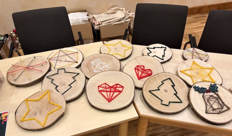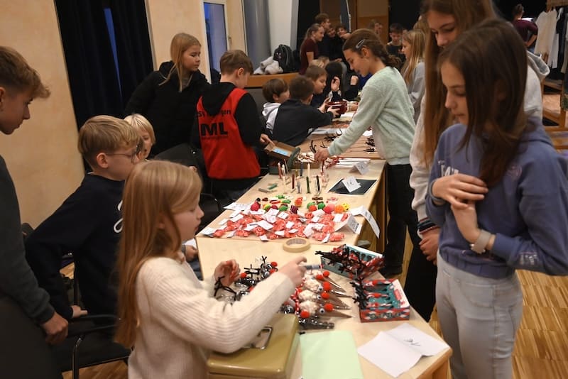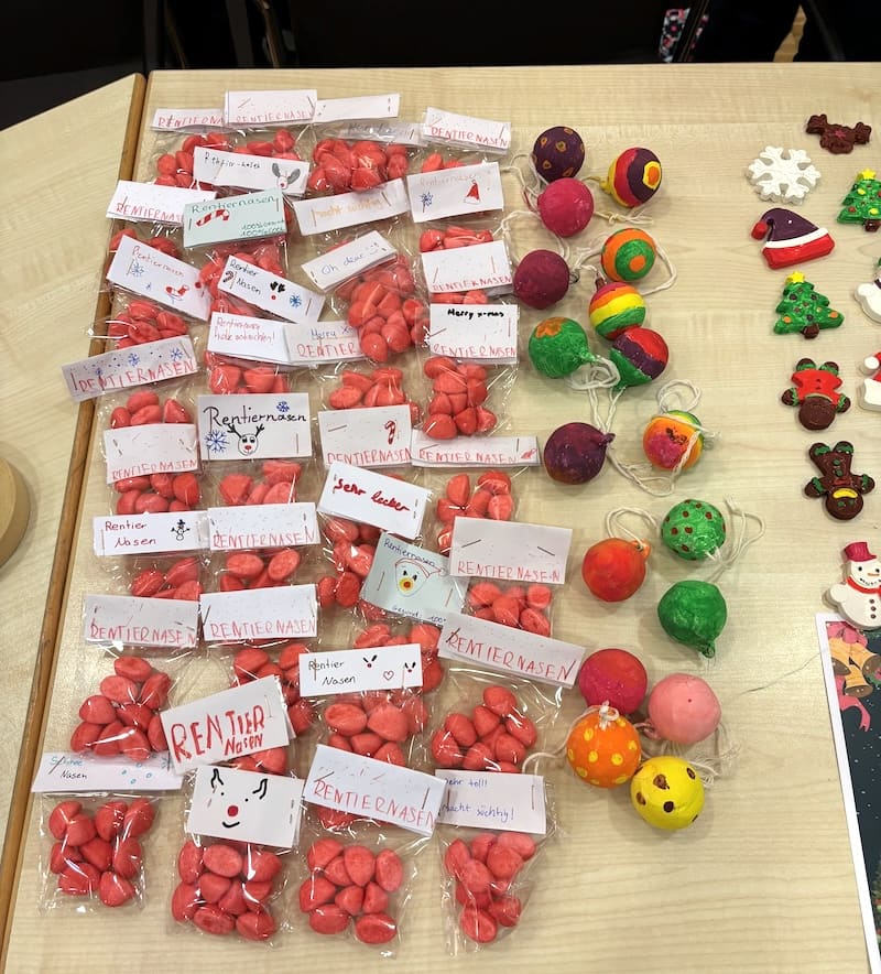 Als Vorbereitung auf den Marzar wurden in den Wochen zuvor zahlreiche Weihnachtsartikel von den Schülerinnen und Schülern gebastelt. Dabei wurden unter anderem Dekoartikel aus Holz, Weihnachtskarten, Christbaumschmuck, Jutebeutel, Seifen und Kerzen hergestellt bzw. gestaltet. Zum einen haben viele Schüler:innen im Unterricht und zuhause fleißig mitgemacht, zum anderen wurden auch vier Nachmittagstermine von den Freiwilligendienstlern angeboten, bei denen vor allem Schüler:innen der Jahrgänge 5 bis 7 mit viel Spaß und Kreativität am Werkeln waren.