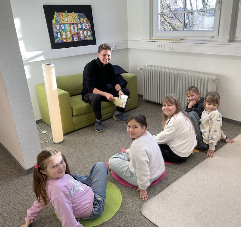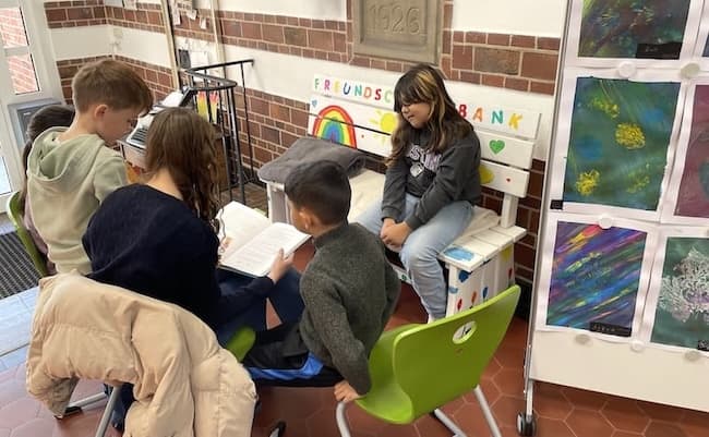 Nach einer stimmungsvollen Begrüßung in der Overberg-Turnhalle und einem ersten gegenseitigen Kennenlernen verteilen sich Vorleser und Zuhörer kleingruppenweise in allen Ecken der Schule. Man macht es sich gemütlich, kommt miteinander ins Gespräch, und natürlich wird vorgelesen. Passend zum diesjährigen Motto „Vorlesen spricht deine Sprache“ ist der Vielfalt der Geschichten keine Grenze gesetzt und es wird sogar eine ukrainische Vorlesegruppe gebildet, die die Erlebnisse von „Bobo Siebenschläfer“ in der eigenen Muttersprache verfolgt. „Ich fand es toll, dass Melvin uns auf Ukrainisch vorgelesen und uns Fragen zur Geschichte gestellt hat. Melvin war total nett, das hat Spaß gemacht!“, sagt Emiliia aus Klasse 2b mit leuchtenden Augen. Auch Karl ist begeistert: „Wir konnten zum Vorgelesenen Bewegungen mitmachen. Ferdinand hat mitgesprochen, weil er Pippi Langstrumpf auswendig kann. Ich fand das klasse.“ Den gegenseitigen Gewinn der Aktion bestätigt Marianum-Schülerin Alea: „Am Anfang war ich ganz schön aufgeregt, aber die Kinder waren sehr interessiert und wir lagen sofort auf einer Wellenlänge. Es war ein super Erlebnis!“
