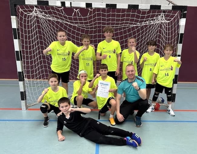 Einen tollen Handballtag erlebten die U14 Jungen am 09.12.2025 in Lingen. Beim Kreis-und Kreisgruppenentscheid erreichte die Mannschaft von Betreuer Stefan Sträche den 2. Platz hinter dem favorisierten Nordhornern. Nachdem im Vorjahr die junge Mannschaft um Julius Brauer noch recht chancenlos war, zeigte sie in diesem Jahr eine hervorragende Leistung.Im ersten Spiel gegen die Gastgeber vom Georgianum lag man nach gutem Start zur Halbzeit mit 7:9 hinten. Doch angeführt vom starken Torwart Enno Wermes gelang es den Meppenern das Spiel im zweiten Durchgang zu drehen und knapp mit 15:14 für sich zu entscheiden. Julius Brauer und Emil Többen waren mit je vier Treffern die Torschützen für das Marianum.