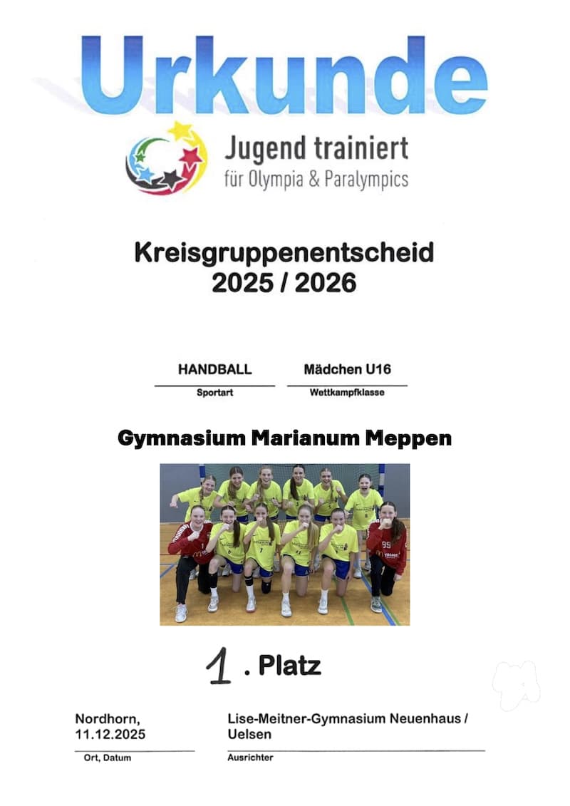 Am 11.12.25 trafen sich in Neuenhaus die Mädchenteams des Burggymnasiums Bentheim, des Evangelischen sowie des Staatlichen Gymnasiums aus Nordhorn, der Oberschule Schüttorf, des Lise-Meitner-Gymnasiums aus Neuenhaus und des Marianums aus Meppen zum Kreisgruppenentscheid im Wettbewerb Jugend trainiert für Olympia WK III.