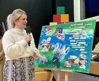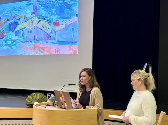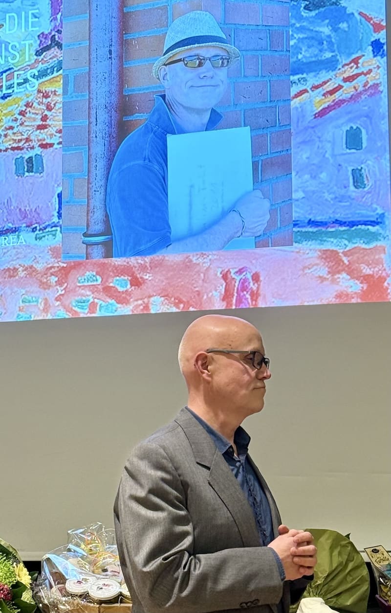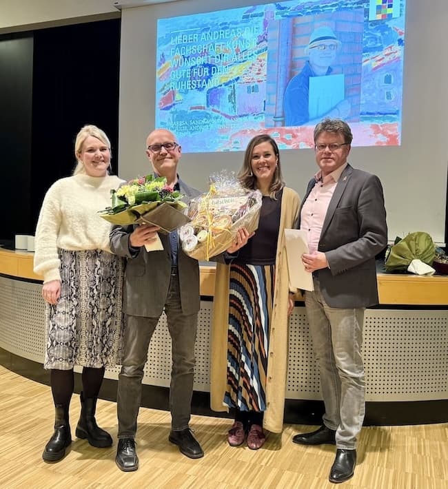 Andreas Hoveling tritt zum Ende des Halbjahres in den wohlverdienten Ruhestand. Nach seinem Wechsel ans Marianum im Jahr 2009 versah Andreas seinen Dienst mit „unerschütterlicher Gelassenheit und besonderer Begeisterungsfähigkeit für das Fach Kunst – insbesondere, wenn es um die praktischen Arbeiten der Schülerinnen und Schüler ging“, so Schulleiter Rave. Im Anschluss waren es Sandra Pulina und Maresa Krüßel, die einen kreativ-bunten Rückblick auf Andreas´ Zeit an unserer Schule lieferten. Hervorzuheben galt es unter anderem Gewinn bringende Kooperationen mit dem Moormuseum in Geeste, musikalische Auftritte mit der Lehrerband und zahlreiche künstlerische Vernissagen, gerne auch im Lehrerzimmer. Videos mit den Stimmen einiger Schülerinnen und Schüler rundeten die Verabschiedung des langjährigen Marianers ab: „Sie waren ein toller Lehrer, der Unterricht hat immer Spaß gemacht!“
