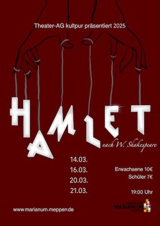 „Sein oder Nichtsein“ und „Der Rest ist Schweigen“ – Redewendungen aus William Shakespeares Schauspiel „Hamlet“ sind mittlerweile fester Bestandteil der deutschen Alltagssprache. Nun bringt die Theater-AG der Sekundarstufe 2 des Gymnasium Marianum Meppen den Klassiker auf die Schulbühne, und zwar in modernem Gewand: Das Schloss eine Baustelle, die Königin volltrunken und Prinz Hamlet dem Wahn verfallen? Im Namen der Rache bittet Hamlet zum letzten Gefecht.