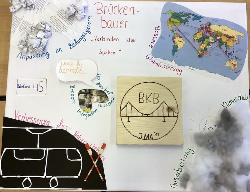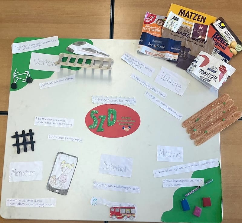 Der KulturProjekte Kurs (Jg. 9) von Herrn Gandt hat sich zur Vor- und Nachbereitung der Junior- und Bundestagswahl 2025 mit dem Grundgesetz, dem Wahlsystem, den Wahlergebnissen und den Parteien theoretisch auseinandergesetzt. Darauf aufbauend folgte eine praktische Projektarbeit, in der die Schüler:innen eine neue Partei (Logo, Slogan, politische Forderungen) auf einer Collage entwickelten. Anschließend präsentieren die Schüler:innen dem Kurs die Collagen und begründeten ihre politischen Forderungen auf den Collagen anhand konkreter Statistiken, Grafiken, Umfragen, Erfahrungen anderer Länder, etc. in einer zusätzlichen Präsentation.