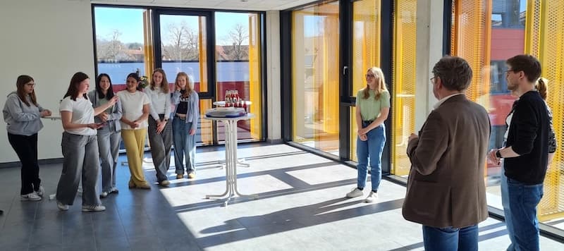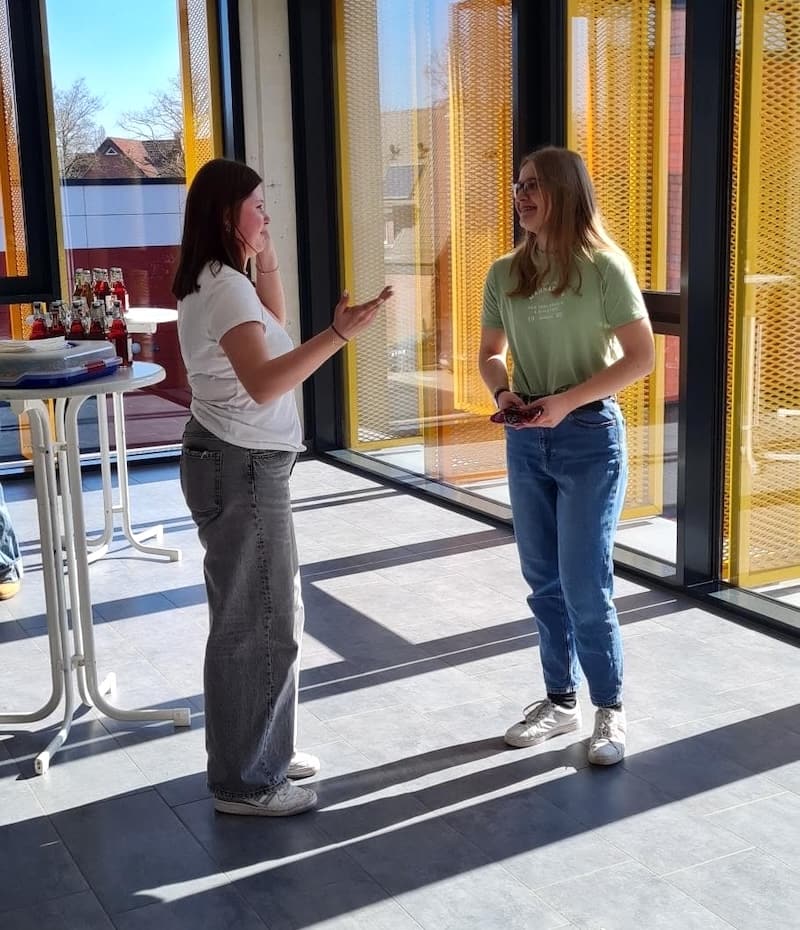 Doch anstelle eines Experiments warteten dort Stehtische mit meinen Lieblings-Plopplimos und einem Blumenstrauß. Meine beiden Projektbetreuer und der Schulleiter standen da. Ich war überwältigt. Ich hielt spontan eine kurze Dankesrede, dann sprach der Schulleiter. Meine Klasse hatte mir sogar Süßigkeiten besorgt. Wir stießen mit den Limos an und feierten ein wenig. Anschließend machten meine Projektbetreuer, der Schulleiter und ich noch ein Foto.