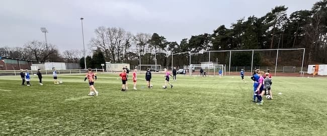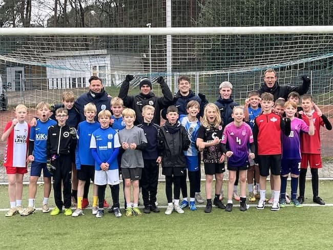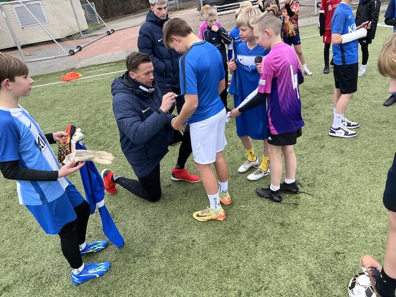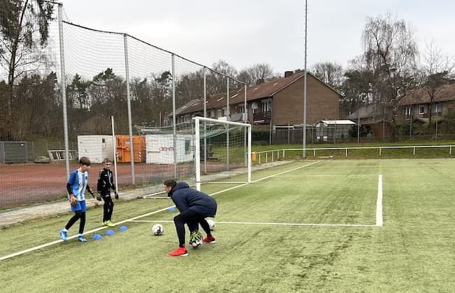 Angeführt von Kapitän Jonas Fedl mit Unterstützung durch Jonathan „Johnny“ Wensing sowie Malte Zumdieck wärmten sich die Jungs zu Beginn erst einmal kurz auf. Neben bekannten Übungen wie Anfersen, Knie hoch oder auch dem Seitgalopp wurde auch die ein oder andere Agility-Übung eingebaut, die auf spätere Aufgaben vorbereitete. Parallel durften unsere beiden Keeper ein Torwarttraining mit Erik Domaschke absolvieren. Vor allem für Tom Anneken war dies sicherlich großer Ansporn, denn er ist bereits Keeper im NLZ und wird hoffentlich in ein paar Jahren im wahrsten Sinne des Wortes in die Fußstapfen Domaschkes treten.