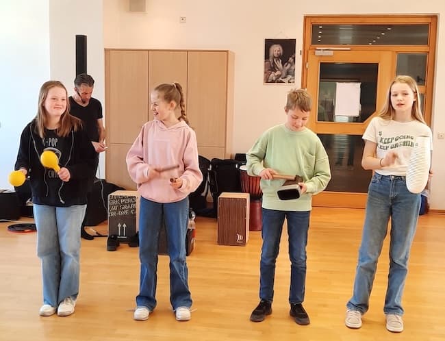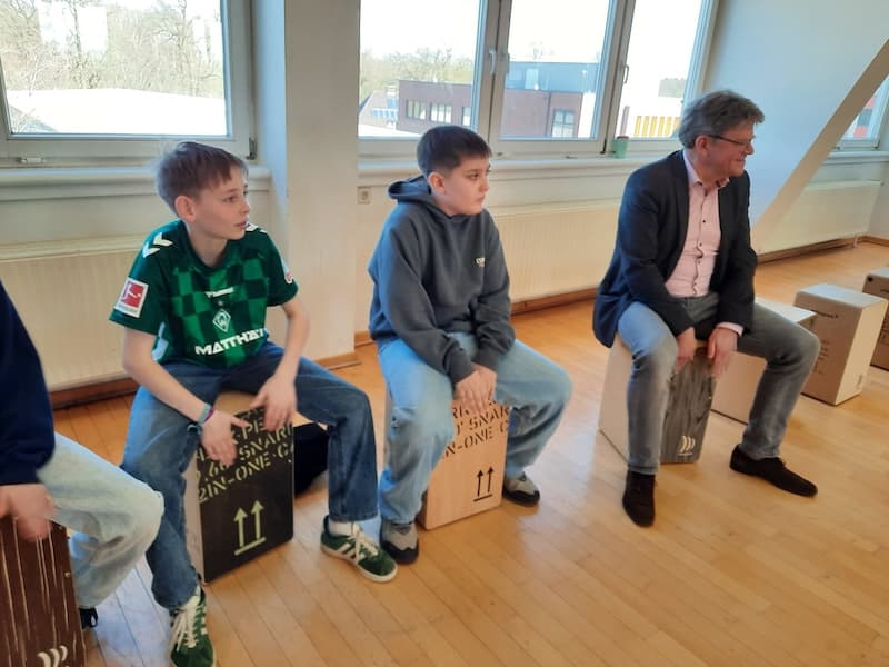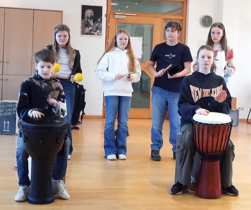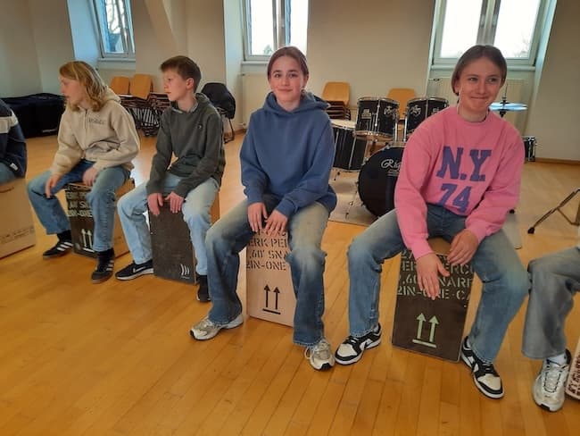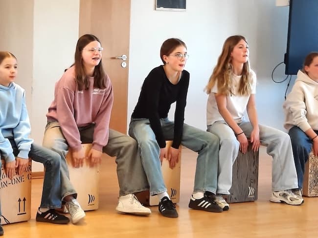 Es groovt und slapt gewaltig, wenn eine komplette Klasse Sechstklässler mit 30 Cajons ausgestattet im Takt zu fetzigem Rock und Pop den Musiksaal beschallt. Der ungewohnte Sound dringt durch die dicken Mauern des Schulgebäudes und der Klang füllt noch den angrenzenden Schulhof und Park. „Was um Himmels willen“, fragen sich arglose Menschen auf dem Gelände, „ist denn nun los?“