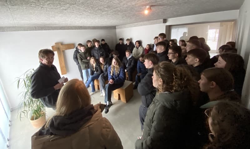 Am Schluss der Ausstellung ging es für alle noch einmal in die kleine Kapelle neben dem ehemaligen Konzentrationslager. Dort gibt es drei verschiedene Räume mit unterschiedlichen, künstlerisch gestalteten Elementen.