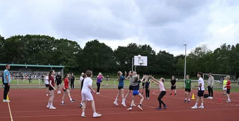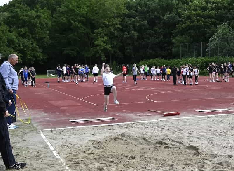 Für den Jahrgang 7 und 9 war das Sportfest bereits willkommene Routine. Die 7. Klässler absolvierten ihren Mehrkampf ebenfalls in allen vier Disziplinen, wobei die besten drei Ergebnisse gewertet wurden und nur ein Streichergebnis vorhanden war. Auf dieses Streichergebnis mussten die 9. Klässler verzichten. Der Mehrkampf ist bei ihnen als Vierkampf ausgeschrieben. Neben dem Kampf um Ehren-und Siegerurkunde duellierten sich die Klassen der Jahrgänge in kleinen Wettbewerben. Im Völkerballturnier des Jahrgangs 7 hatte die 7e die Nase vorn. Beim Knacken des 3000m-Rekords der Jahrgangsstufe 9 konnte sich die 9c durchsetzen. Beiden Klassen herzlichen Glückwunsch!