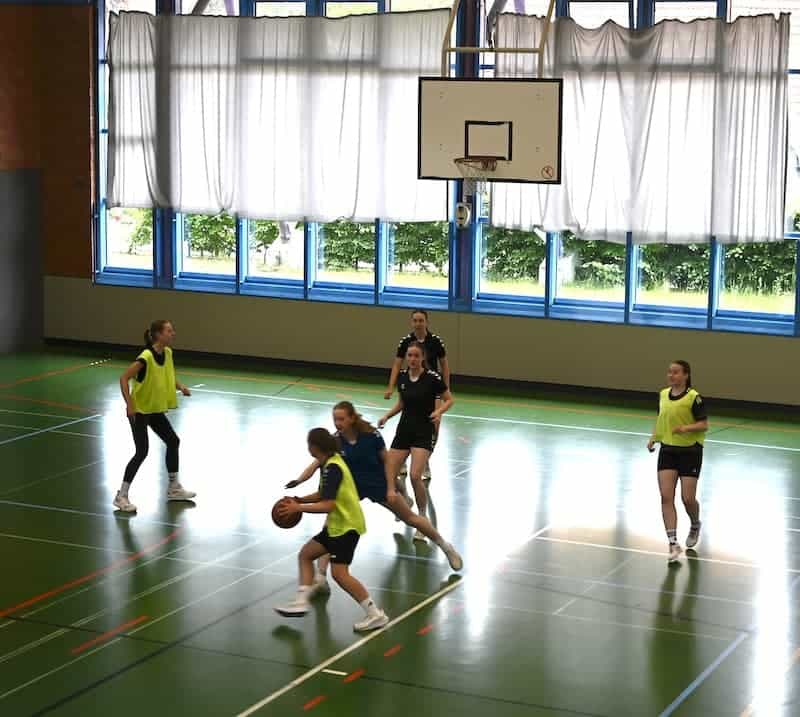 In der großen Halle waren es dann die 10. Klässler, die in einem 3X3-Turnier ihren Jahrgangssieger ermittelte. Die olympische Variante des Basketballspiels ist eine Streetballvariante, die auf einen Korb gespielt wird und von vielen Umschaltmomenten und einer hohen Intensität geprägt ist. Diese Intensität war in der Halle spürbar. Alle Klassen stellten zwei Mädchen und zwei Jungen-Teams, die gegeneinander spielten. Am Ende wurden alle Ergebnisse zusammengenommen und so eine Siegerklasse ermittelten. Die 10d zeigte von Beginn an, dass der Sieg nur über sie laufen wird. Und so konnte sich die Klasse in einem insgesamt spannenden Turnier am Ende souverän durchsetzen. Herzlichen Glückwunsch an die 10d.