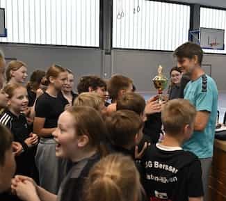 Für die 6. Klässler fand in der kleinen Halle das Chickenballturnier statt. Beim Chickenball, oder Hühnerball genannt, müssen die gegnerischen Spieler oder Hütchen, die auf Kästen platziert sind, mit Softbällen abgeworfen werden. Sowohl die Schülerinnen und Schüler als auch die Fachgruppe Sport waren im Vorfeld gespannt, wie die Wettkämpfe verlaufen würden. Schnell war klar, dass die Klassen im Wettkampf gegeneinander Feuer und Flamme waren und sich umkämpfte Spiele entwickelten. So bot sich eine tolle Stimmung in der Halle, die von gegenseitigem Support und Anspannung geprägt war. Am Ende konnte sich schließlich die 6d mit einem knappen Vorsprung durchsetzen und sich den Pokal für das erste Chickenballturnier sichern. Der Jubel bei der Siegerehrung kannte keine Grenzen. Herzlichen Glückwunsch an die 6d.