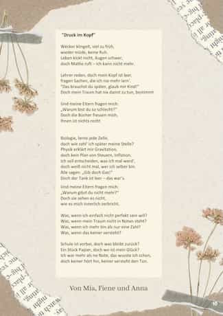 Schulbus-Geschichten, Kurzgeschichten über Einsamkeit und Mutproben und Gedichte über den „Druck im Kopf“, den Schule bei den Jugendlichen auslöst. Die Texte aus der Feder von Achtklässlerinnen und Achtklässlern am Gymnasium Marianum Meppen umfassen die volle Bandbreite jugendlichen Erlebens.