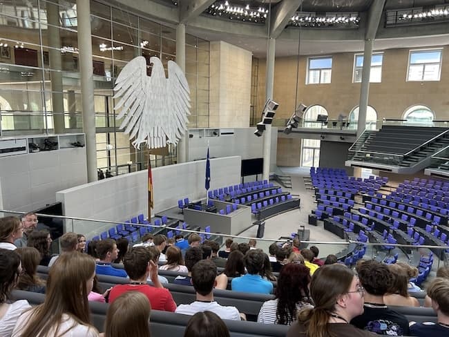 Heute wird es politisch: die Schüler:innen des Marianums besuchen das Herz der deutschen Demokratie, den Bundestag. In einem Vortrag auf der Besuchertribüne werden Funktion und Arbeitsweise des Parlaments erläutert. Danach erzählen Mitarbeiterinnen von MdB Albert Stegemann von ihrer Arbeit und der eines Bundestagsabgeordneten. Zum Abschluss fährt die Gruppe nach oben in die Reichstagskuppel und genießt den großartigen Ausblick über Berlin.