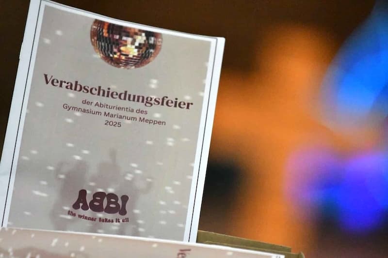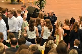 Die Rolle des Schlussredners übernahm Jahrgangskoordinator Uli Weßling. „Es ist schwer, jemanden zu verabschieden, den man gar nicht gehen lassen möchte“, begannen emotionale Abschiedsworte an seinen „Lieblingsjahrgang“. „Ich bin froh und glücklich, das alles mit euch erleben zu dürfen“, betonte Weßling und erinnerte zum Beispiel an eine legendäre After-Show-Party nach dem Varieté. Man habe sich immer auf den Jahrgang verlassen können, wenn es darauf ankam. Nicht zuletzt in einigen Momenten, die für alle schwierig waren. „Hoffentlich sehen wir uns mal in Meppen wieder“, richtete sich der Blick am Ende nach vorne – auch auf den bereitstehenden Sektempfang und den Abiball im Saal Kamp am Samstag.