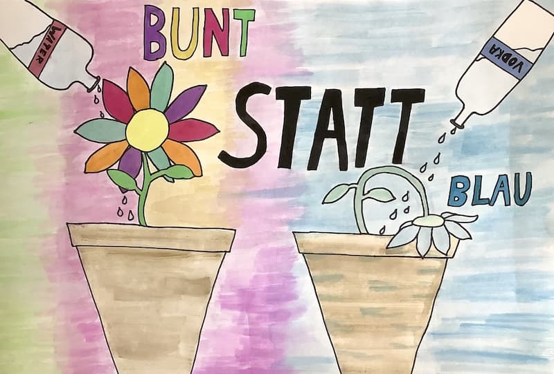 Annas (3. Platz) Statement zu ihrem Bild: „Als ich mein Bild gemalt habe, wollte ich deutlich machen, wie Menschen mit einem Alkoholproblem von der Welt und vom normalen Leben abgeschottet sein können und das Bunte nicht mehr sehen. Dies habe ich in meinem Bild mit einem Menschen in blauen Farben und einer bunten Welt hinter ihm gemalt. Durch die blauen Töne verdeutliche ich den Alkoholkonsum des Menschen und die Welt hinter ihm ist das, was er dadurch täglich verpasst.