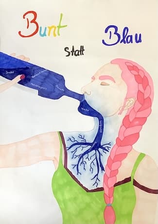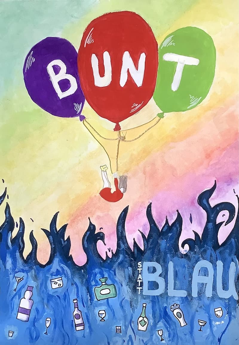 Celinas (2. Platz) Statement zu ihrem Bild: „Die Idee entwickelte sich sehr eigenständig. Ich habe von einem Alkoholiker-Fall in meinem Umfeld mitbekommen, woran ich bei dem Thema „bunt statt blau“ sofort gedacht habe. Dann kam die Idee vom „Ertrinken“ im Alkohol und dass das einen gewissen Zusammenhang hat, wie man in meinem Slogan „(Er-)trinke nicht“ erkennen kann. Viele Alkoholiker verlieren den Bezug zum Leben, zu Freunden, Familie usw., weshalb ich dann auf die Hände gekommen bin, die der ertrinkenden Person helfen und sie sozusagen zurück ins Leben ziehen.“