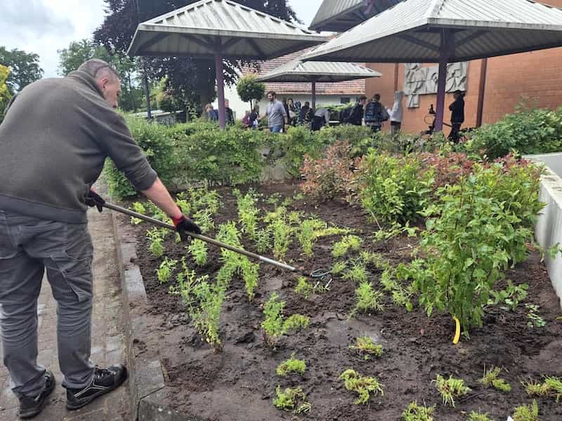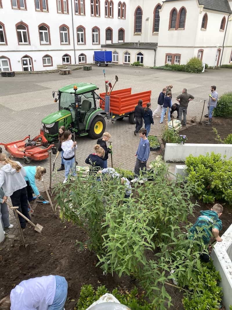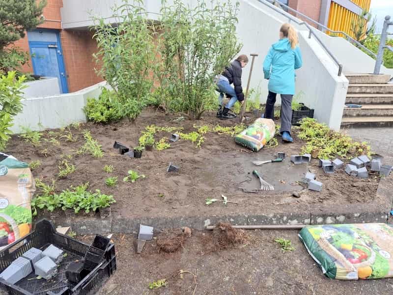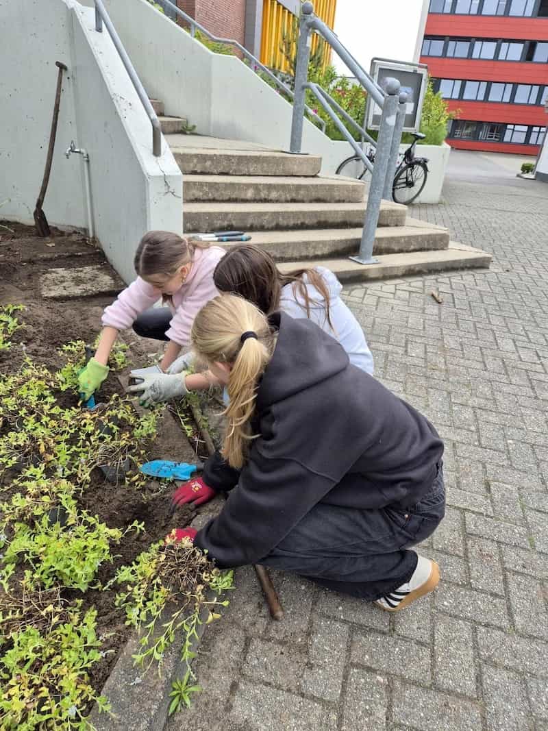 Die Klasse 7c hat mit unserem Schulgärtner Wolfgang Pekrul zusammen zwei vielseitige Staudenbeete vor der großen Turnhalle gepflanzt, wo vorher nur Kirschlorbeeren standen. Durch die Beseitigung dieser Sträucher konnte eine für Insekten nur wenig attraktive Fläche in eine bunte und einladende Futterquelle verwandelt werden. Aber nicht nur die Insekten freuen sich über diese Veränderung, auch die Fachgruppe Sport äußerte sich sehr positiv über die Neugestaltung ihres Vorgartens.