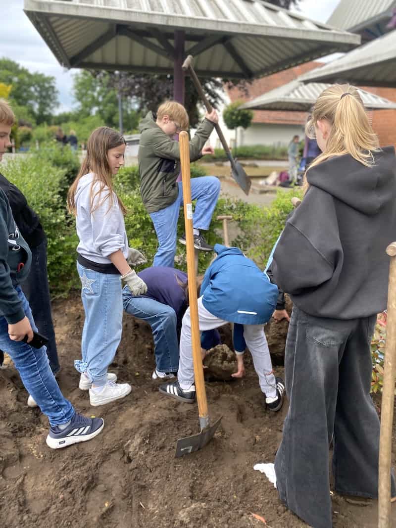 Die Garten-AG hat im Schulgarten ein neues Himbeerspalier gebaut und bepflanzt und zusätzlich ein Blaubeerbeet eingerichtet. Dadurch konnte die Vielfalt der Nutzpflanzen gesteigert werden, und in zwei Beeten wurde durch diese Maßnahme der Übergang von der jährlich wechselnden zu einer mehrjährigen Nutzung durchgeführt.